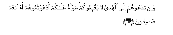 193. Wa-in tadAAoohum ila alhuda la yattabiAAookum sawaon AAalaykum adaAAawtumoohum am antum samitoona