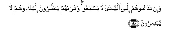198. Wa-in tadAAoohum ila alhuda la yasmaAAoo watarahum yanthuroona ilayka wahum la yubsiroona