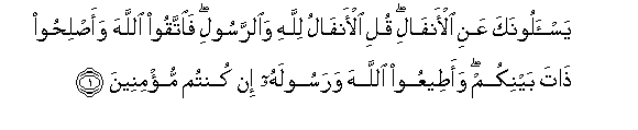 1. Yas-aloonaka AAani al-anfali quli al-anfalu lillahi waalrrasooli faittaqoo Allaha waaslihoo thata baynikum waateeAAoo Allaha warasoolahu in kuntum mu/mineena