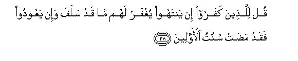 38. Qul lillatheena kafaroo in yantahoo yughfar lahum ma qad salafa wa-in yaAAoodoo faqad madat sunnatu al-awwaleena