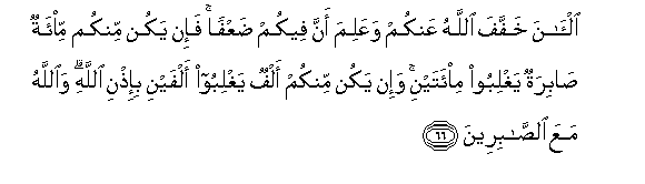 66. Al-ana khaffafa Allahu AAankum waAAalima anna feekum daAAfan fa-in yakun minkum mi-atun sabiratun yaghliboo mi-atayni wa-in yakun minkum alfun yaghliboo alfayni bi-ithni Allahi waAllahu maAAa alssabireena