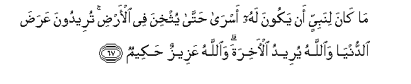 67. Ma kana linabiyyin an yakoona lahu asra hatta yuthkhina fee al-ardi tureedoona AAarada alddunya waAllahu yureedu al-akhirata waAllahu AAazeezun hakeemun