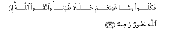 69. Fakuloo mimma ghanimtum halalan tayyiban waittaqoo Allaha inna Allaha ghafoorun raheemun