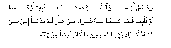 12. Wa-itha massa al-insana alddurru daAAana lijanbihi aw qaAAidan aw qa-iman falamma kashafna AAanhu durrahu marra kaan lam yadAAuna ila durrin massahu kathalika zuyyina lilmusrifeena ma kanoo yaAAmaloona