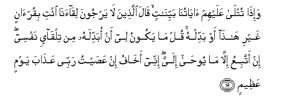 15. Wa-itha tutla AAalayhim ayatuna bayyinatin qala allatheena la yarjoona liqaana i/ti biqur-anin ghayri hatha aw baddilhu qul ma yakoonu lee an obaddilahu min tilqa-i nafsee in attabiAAu illa ma yooha ilayya innee akhafu in AAasaytu rabbee AAathaba yawmin AAatheemin
