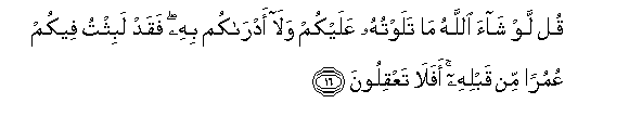 16. Qul law shaa Allahu ma talawtuhu AAalaykum wala adrakum bihi faqad labithtu feekum AAumuran min qablihi afala taAAqiloona