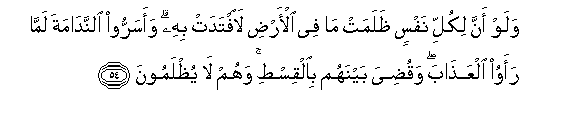 54. Walaw anna likulli nafsin thalamat ma fee al-ardi laiftadat bihi waasarroo alnnadamata lamma raawoo alAAathaba waqudiya baynahum bialqisti wahum la yuthlamoona