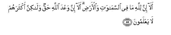 55. Ala inna lillahi ma fee alssamawati waal-ardi ala inna waAAda Allahi haqqun walakinna aktharahum la yaAAlamoona