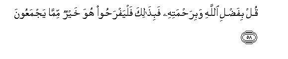 58. Qul bifadli Allahi wabirahmatihi fabithalika falyafrahoo huwa khayrun mimma yajmaAAoona
