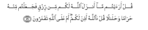 59. Qul araaytum ma anzala Allahu lakum min rizqin fajaAAaltum minhu haraman wahalalan qul allahu athina lakum am AAala Allahi taftaroona