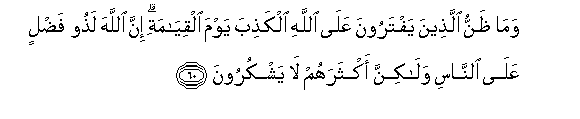 60. Wama thannu allatheena yaftaroona AAala Allahi alkathiba yawma alqiyamati inna Allaha lathoo fadlin AAala alnnasi walakinna aktharahum la yashkuroona
