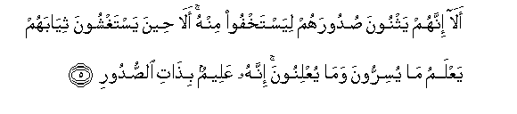 5. Ala innahum yathnoona sudoorahum liyastakhfoo minhu ala heena yastaghshoona thiyabahum yaAAlamu ma yusirroona wama yuAAlinoona innahu AAaleemun bithati alssudoori