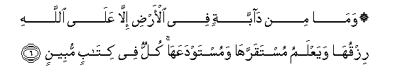 6. Wama min dabbatin fee al-ardi illa AAala Allahi rizquha wayaAAlamu mustaqarraha wamustawdaAAaha kullun fee kitabin mubeenin
