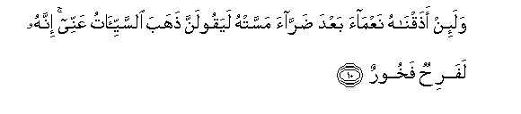 10. Wala-in athaqnahu naAAmaa baAAda darraa massat-hu layaqoolanna thahaba alssayyi-atu AAannee innahu lafarihun fakhoorun