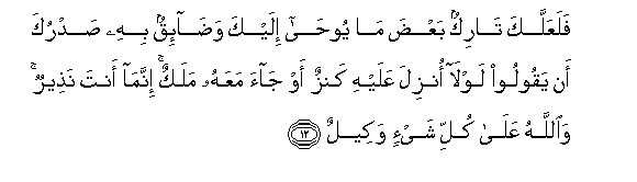 12. FalaAAallaka tarikun baAAda ma yooha ilayka wada-iqun bihi sadruka an yaqooloo lawla onzila AAalayhi kanzun aw jaa maAAahu malakun innama anta natheerun waAllahu AAala kulli shay-in wakeelun