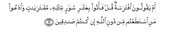 13. Am yaqooloona iftarahu qul fa/too biAAashri suwarin mithlihi muftarayatin waodAAoo mani istataAAtum min dooni Allahi in kuntum sadiqeena