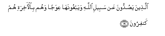 19. Allatheena yasuddoona AAan sabeeli Allahi wayabghoonaha AAiwajan wahum bial-akhirati hum kafiroona