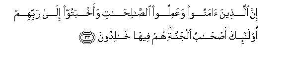 23. Inna allatheena amanoo waAAamiloo alsalihati waakhbatoo ila rabbihim ola-ika as-habu aljannati hum feeha khalidoona