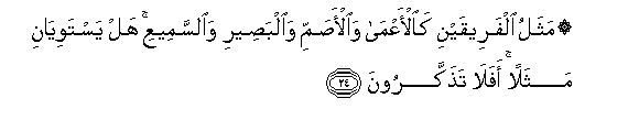 24. Mathalu alfareeqayni kaal-aAAma waal-asammi waalbaseeri waalssameeAAi hal yastawiyani mathalan afala tathakkaroona