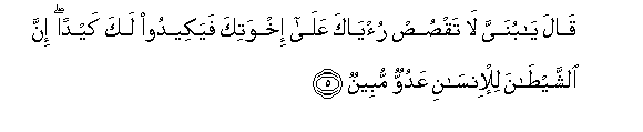 5. Qala ya bunayya la taqsus ru/yaka AAala ikhwatika fayakeedoo laka kaydan inna alshshaytana lil-insani AAaduwwun mubeenun