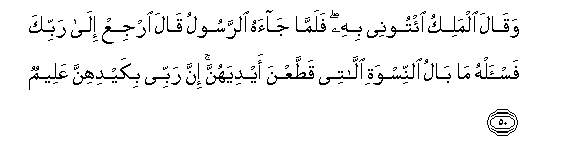 50. Waqala almaliku i/toonee bihi falamma jaahu alrrasoolu qala irjiAA ila rabbika fais-alhu ma balu alnniswati allatee qattaAAna aydiyahunna inna rabbee bikaydihinna AAaleemun