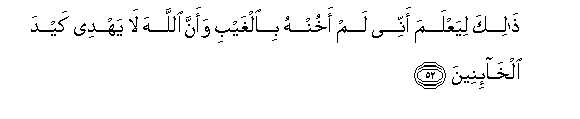 52. Thalika liyaAAlama annee lam akhunhu bialghaybi waanna Allaha la yahdee kayda alkha-ineena