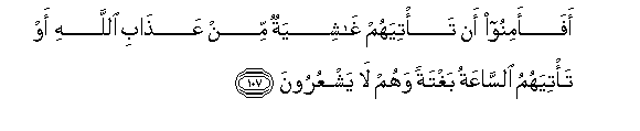 107. Afaaminoo an ta/tiyahum ghashiyatun min AAathabi Allahi aw ta/tiyahumu alssaAAatu baghtatan wahum la yashAAuroona