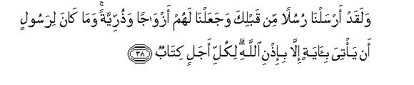 38. Walaqad arsalna rusulan min qablika wajaAAalna lahum azwajan wathurriyyatan wama kana lirasoolin an ya/tiya bi-ayatin illa bi-ithni Allahi likulli ajalin kitabun