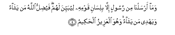 4. Wama arsalna min rasoolin illa bilisani qawmihi liyubayyina lahum fayudillu Allahu man yashao wayahdee man yashao wahuwa alAAazeezu alhakeemu