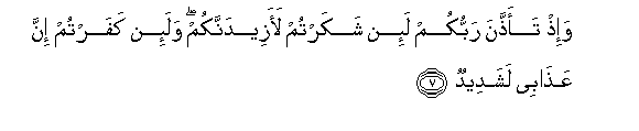 7. Wa-ith taaththana rabbukum la-in shakartum laazeedannakum wala-in kafartum inna AAathabee lashadeedun