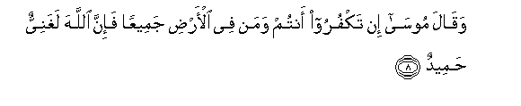 8. Waqala moosa in takfuroo antum waman fee al-ardi jameeAAan fa-inna Allaha laghaniyyun hameedun