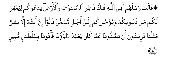 10. Qalat rusuluhum afee Allahi shakkun fatiri alssamawati waal-ardi yadAAookum liyaghfira lakum min thunoobikum wayu-akhkhirakum ila ajalin musamman qaloo in antum illa basharun mithluna tureedoona an tasuddoona AAamma kana yaAAbudu abaona fa/toona bisultanin mubeenin