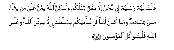 11. Qalat lahum rusuluhum in nahnu illa basharun mithlukum walakinna Allaha yamunnu AAala man yashao min AAibadihi wama kana lana an na/tiyakum bisultanin illa bi-ithni Allahi waAAala Allahi falyatawakkali almu/minoona