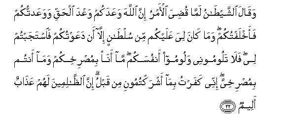 22. Waqala alshshaytanu lamma qudiya al-amru inna Allaha waAAadakum waAAda alhaqqi wawaAAadtukum faakhlaftukum wama kana liya AAalaykum min sultanin illa an daAAawtukum faistajabtum lee fala taloomoonee waloomoo anfusakum ma ana bimusrikhikum wama antum bimusrikhiyya innee kafartu bima ashraktumooni min qablu inna alththalimeena lahum AAathabun aleemun
