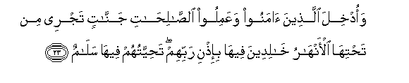 23. Waodkhila allatheena amanoo waAAamiloo alssalihati jannatin tajree min tahtiha al-anharu khalideena feeha bi-ithni rabbihim tahiyyatuhum feeha salamun