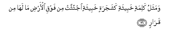 26. Wamathalu kalimatin khabeethatin kashajaratin khabeethatin ijtuththat min fawqi al-ardi ma laha min qararin
