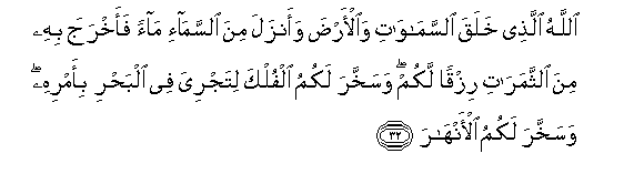 32. Allahu allathee khalaqa alssamawati waal-arda waanzala mina alssama-i maan faakhraja bihi mina alththamarati rizqan lakum wasakhkhara lakumu alfulka litajriya fee albahri bi-amrihi wasakhkhara lakumu al-anhara