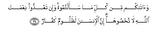 34. Waatakum min kulli ma saaltumoohu wa-in taAAuddoo niAAmata Allahi la tuhsooha inna al-insana lathaloomun kaffarun