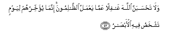 42. Wala tahsabanna Allaha ghafilan AAamma yaAAmalu alththalimoona innama yu-akhkhiruhum liyawmin tashkhasu feehi al-absaru