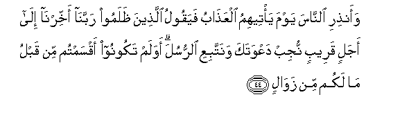 44. Waanthiri alnnasa yawma ya/teehimu alAAathabu fayaqoolu allatheena thalamoo rabbana akhkhirna ila ajalin qareebin nujib daAAwataka wanattabiAAi alrrusula awa lam takoonoo aqsamtum min qablu ma lakum min zawalin