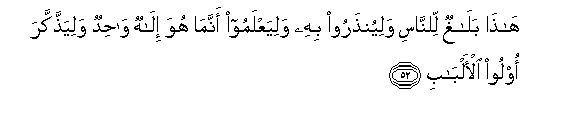 52. Hatha balaghun lilnnasi waliyuntharoo bihi waliyaAAlamoo annama huwa ilahun wahidun waliyaththakkara oloo al-albabi