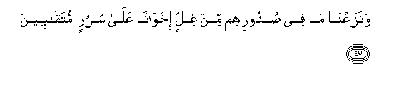 47. WanazaAAna ma fee sudoorihim min ghillin ikhwanan AAala sururin mutaqabileena