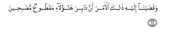 66. Waqadayna ilayhi thalika al-amra anna dabira haola-i maqtooAAun musbiheena