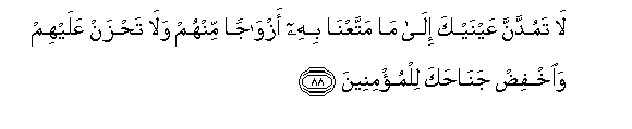 88. La tamuddanna AAaynayka ila ma mattaAAna bihi azwajan minhum wala tahzan AAalayhim waikhfid janahaka lilmu/mineena