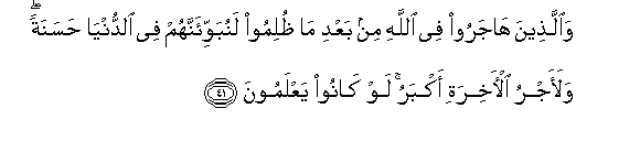 41. Waallatheena hajaroo fee Allahi min baAAdi ma thulimoo lanubawwi-annahum fee alddunya hasanatan walaajru al-akhirati akbaru law kanoo yaAAlamoona