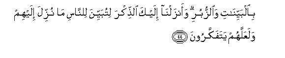 44. Bialbayyinati waalzzuburi waanzalna ilayka alththikra litubayyina lilnnasi ma nuzzila ilayhim walaAAallahum yatafakkaroona