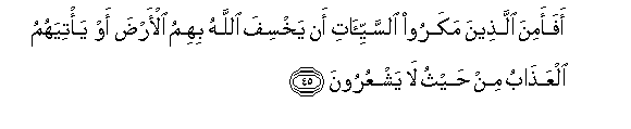 45. Afaamina allatheena makaroo alssayyi-ati an yakhsifa Allahu bihimu al-arda aw ya/tiyahumu alAAathabu min haythu la yashAAuroona