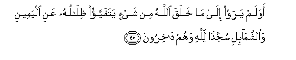 48. Awa lam yaraw ila ma khalaqa Allahu min shay-in yatafayyao thilaluhu AAani alyameeni waalshshama-ili sujjadan lillahi wahum dakhiroona