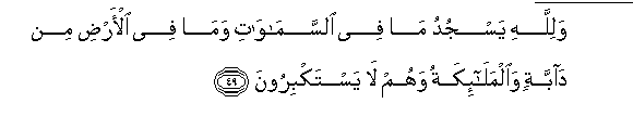 49. Walillahi yasjudu ma fee alssamawati wama fee al-ardi min dabbatin waalmala-ikatu wahum la yastakbiroona