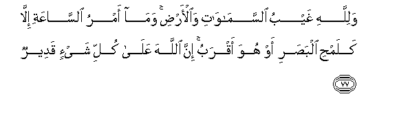 77. Walillahi ghaybu alssamawati waal-ardi wama amru alssaAAati illa kalamhi albasari aw huwa aqrabu inna Allaha AAala kulli shay-in qadeerun